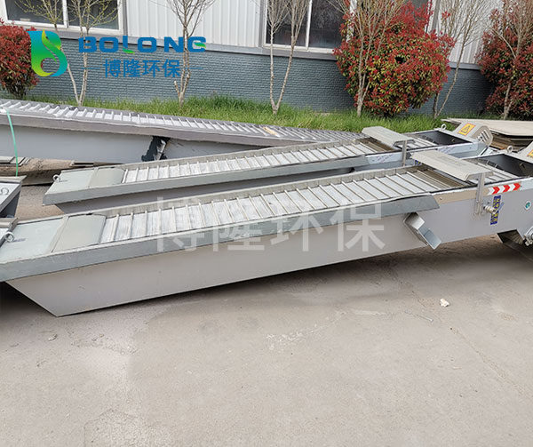 耙齒鏈運轉(zhuǎn)到設(shè)備的上部時,由于槽輪和彎軌的導(dǎo)向,使每組耙齒之間產(chǎn)生相對自清運動,絕大部分固體物質(zhì)靠重力落下。另一部分則依靠清掃器的反向運動把粘在耙齒上的雜物清掃干凈。